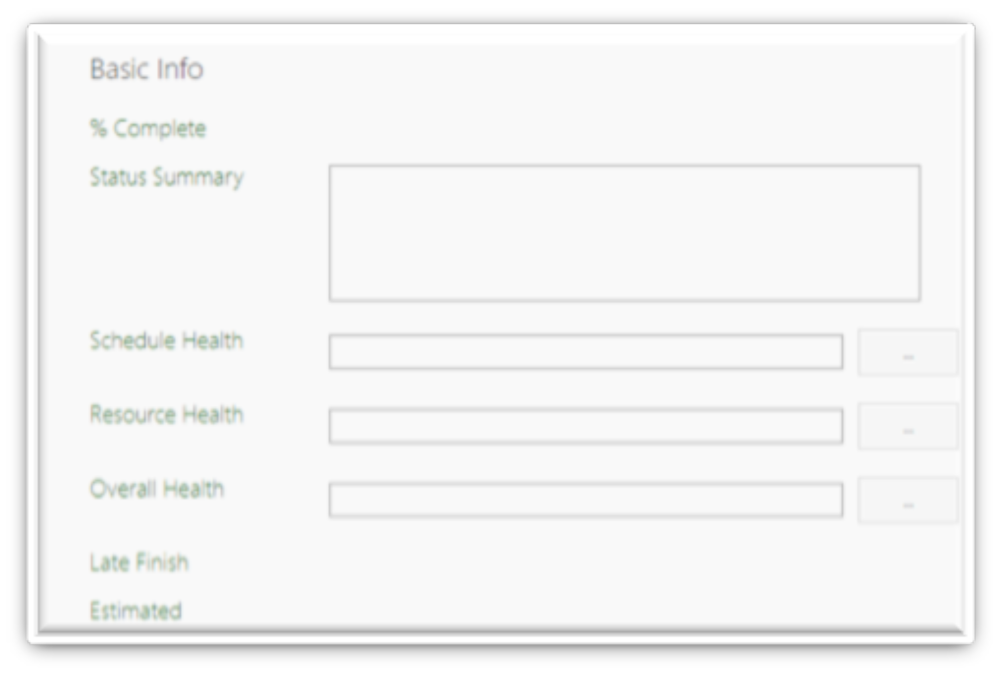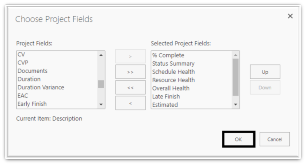 - For example, I have added % complete, Status Summary, Schedule Health, Resource health, Overall health, Late Finish and Estimated. Once the fields have been added to the right, click OK.