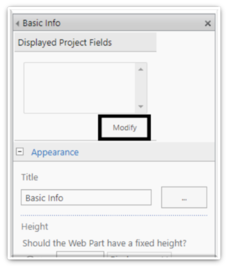 - A panel will be displayed along the right side of the screen with options for modifying the web part. Click on modify, at the top, to add fields to the Project Detail Page.