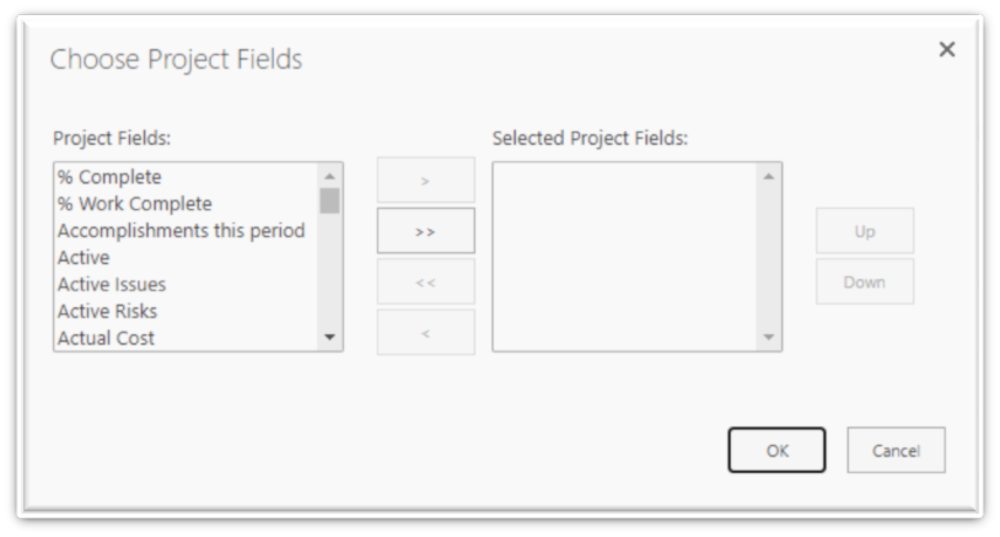 - The “Choose Project Fields” dialog box will open. On the left side we see all the fields available to add and, on the right, we see the project fields currently on the web part. Because this is a brand-new Project Detail page, there is nothing listed on the right. Click on the field name(s) you want to add from the list on the left and then click the top arrow to move them to the right side. This will add them to your Project Detail Page once you apply the changes.